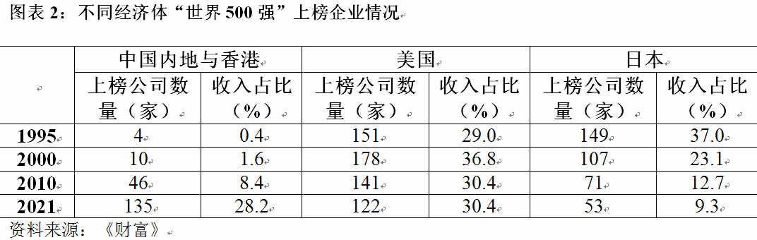 从数量上看,1995年《财富》杂志首次发布世界500强排行榜时,只有中国银行、中国中化和中粮集团3家中国内地公司上榜。2001年中国加入WTO时有11家内地公司上榜。2008年以来,入围世界500强的中国内地及香港企业数量先后超过了德国、法国、英国和日本。2020年,中国内地及香港公司实现历史性跨越,上榜数量达到124家,第一次超过美国(121家);2021年,该上榜数(135家)继续领先于美国(122家)。