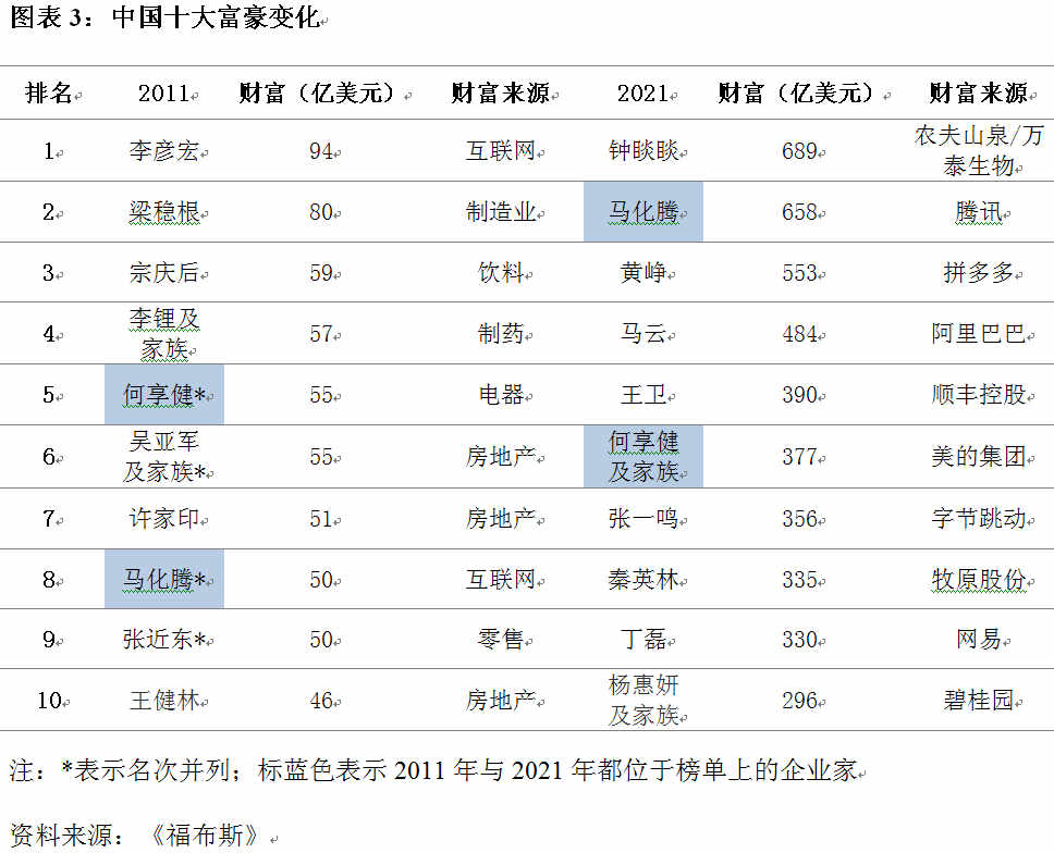 榜单上中国新富豪的迭代也是令人瞩目的。第一,观察2011年与2021年“福布斯全球亿万富豪榜”中排名前10位的中国富豪,十年间,新晋富豪占到了80%的份额。而对比同一时期美国富豪榜单,若按家族来考虑,新晋富豪仅占30%。