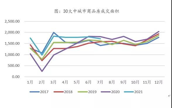 7月份30个大中城市商品房销售面积1730万平方米,较上个月下降70万平方米,环比显著下滑。