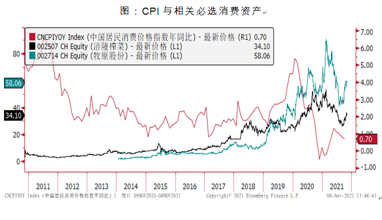 在全球通胀CPI上升的背景下,对通胀敏感性更高的必选消费(储如油米酱醋等)或将受益。在全球PPI上涨背景下,中国PPI向CPI传导较为滞后,9月中国CPI同比增速0.7%,远低于10.7%的PPI水平,预期2022年中国CPI将达到平均2.3%,CPI上涨将使价格弹性低的必选消费受益。10月底以来,以海天味业、李锦记、恒顺醋业为代表的厂家均出现了5%~15%左右产品集体提价。
