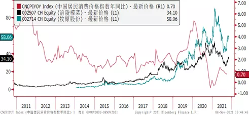在全球PPI上涨背景下,中国PPI向CPI传导较为滞后,9月中国CPI同比增速0.7%,远低于10.7%的PPI水平,预期2022年中国CPI将达到平均2.3%,CPI上涨将使价格弹性低的必选消费受益。
