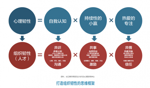 经过对文献和研究资料的梳理整合,我们提炼出了个人韧性提升的三个维度——自我认知、持续性的小赢和热爱专注,并由此上升到组织韧性层面——自我认知上升为企业的“共识”,包括人与人之间、团队与团队之间,以及职级与职能团队间的多维认知;持续性的小赢则变为组织的连贯性目标,以及为达成目标而建立的业务模式、流程、机制和方法,即“共事”;而个人的热爱与专注则对应了企业的热爱共振,包括组织核心竞争力的进化,创新容错机制和专业主义的传承,即“共情”。