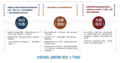 1.战略同频。高管对于企业所制定的战略背后的原理,其为什么存在以及将导向何方仅仅略知一二,并不深究,导致的结果就是在战略往下传导的时候出现衰减。从共识的角度,会出现一把手与高管团队沟通不充分,甚至认为可以没有战略,“我们农民洗脚上田不用想那么远”“西瓜皮滑哪儿算哪儿”(引言来自企业调研访谈口述原文,下同);从共事的角度,战略分解与打法之间的连接普遍欠缺;从共情的角度,战略制定更多聚焦在短期的业绩目标上,缺乏与业务战略相匹配的人才战略。