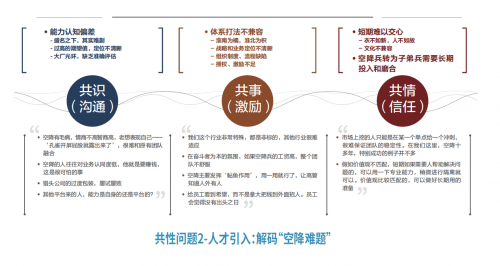 2.人才引入。70%以上的受访企业在过去十几年间都想过采用空降兵的方法,虽然也有个别企业找到了非常优秀的空降高管,但整体来说空降高管的存活率都较低。共识层面,企业一把手对空降高管的能力认知往往会因为期望值过高、“大厂”光环等而有所偏差;共事层面,空降高管会遭遇体系打法不兼容的问题;共情层面,高管从空降兵转为子弟兵需要长期的投入与磨合,导致短期内难以交心,有的一把手甚至认为“空降主要发挥‘鲇鱼作用’,用一用就行了,让高管知道人外有人”。