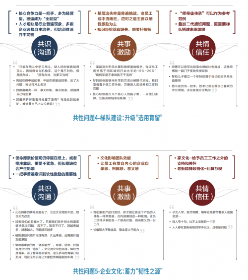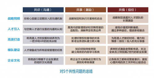 在这样一群“早熟”的青春期企业中,我们梳理出了组织韧性/人才方面的5大共性问题,分别可以从共识、共事和共情的角度进行分析并给出改善建议。