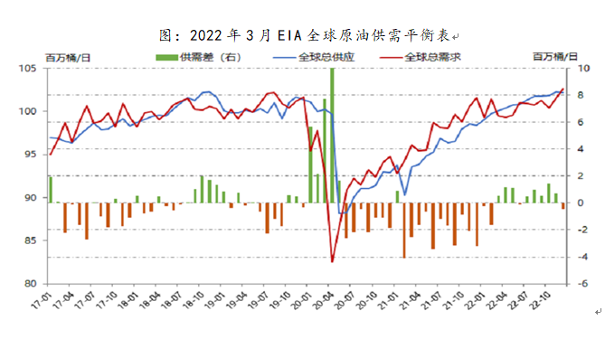 现在情况会有所不一样,尽管西方对俄罗斯的制裁导致了俄油出口下降,但这部分缺口可能通过其他方法在不久的未来补上。俄罗斯大约有550万桶/日的原油出口,西方对俄罗斯的制裁大约影响到俄罗斯300万~400万桶/日的出口量,短期对市场造成极大冲击。但中长期来看,即便俄乌冲突持续,西方对俄制裁不放松,我们认为这部分原油缺口可以通过OPEC+持续释放产能(短期可增加200万桶/日供应)、与伊朗达成协议(增加160万桶/日供应),以及美国页岩油增产(中期可增加40万桶/日)来实现对俄罗斯供应缺口的补充,至于原油需求方面,按照EIA月报,2022年原油需求相较2021年底基本无新增长,大约在1.02亿桶/日,这点与我们对经济的判断一致——美联储加息预期叠加新能源替代,全球原油需求量大约在1.02亿~1.03亿桶/日。