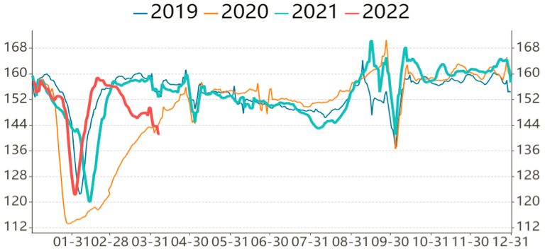 当前疫情管控下,出口与消费都不乐观,3月社零同比增速-3.5%。3月开始,深圳、上海、杭州、太原等较多地区因疫情出现封锁,消费与订单出现显著下滑。3月PMI新订单48.8,新出口订单47.2,全面下降到景气度下方。另外严格的防控政策也影响了部分海外订单——随着新加坡东南亚等国家逐渐回归常态,部分新出口订单出现分流。消费方面从餐饮、影视、全国出行拥堵指数来看,均出现较明显下行(下图)。