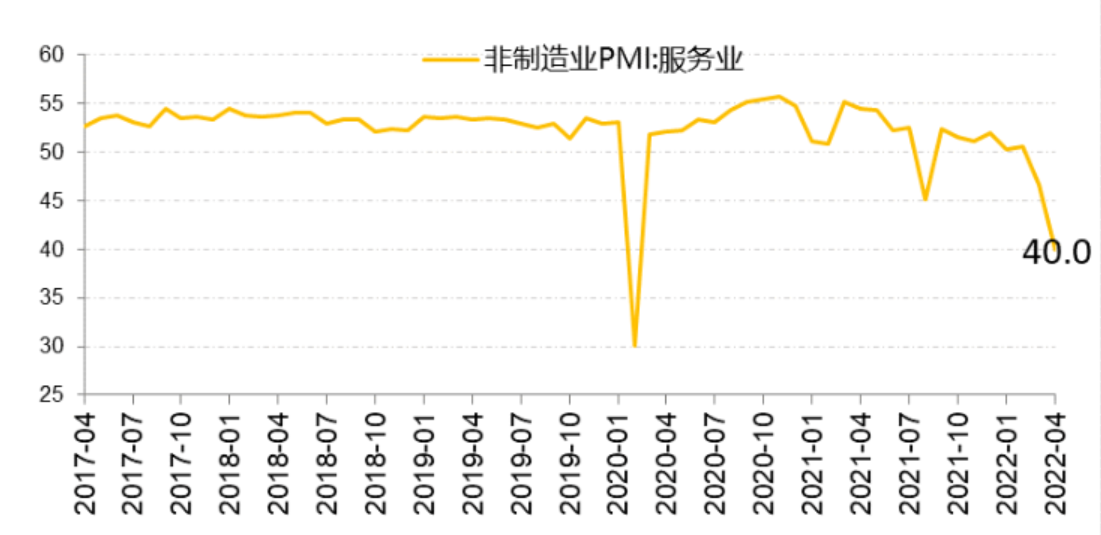 从中国PMI及工业企业开工率、房地产销售、出行、用电量等数据能够观察到中国经济显著的下行压力。4月国家统计局制造业PMI录得47.4,低于3月2.1个百分点,连续两月录得2020年3月以来最低。同时4月中国非制造业PMI仅41.9,大幅低于预期。从PMI看,疫情对中国制造业与服务业景气度影响非常明显(下图)。