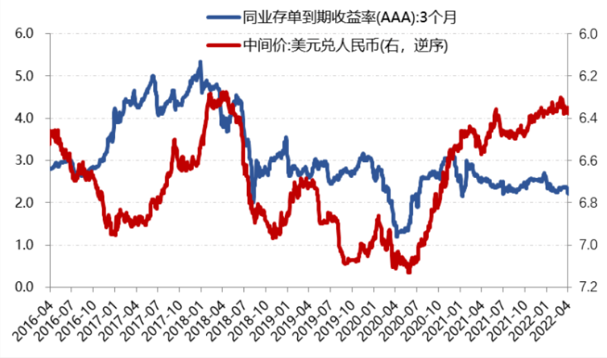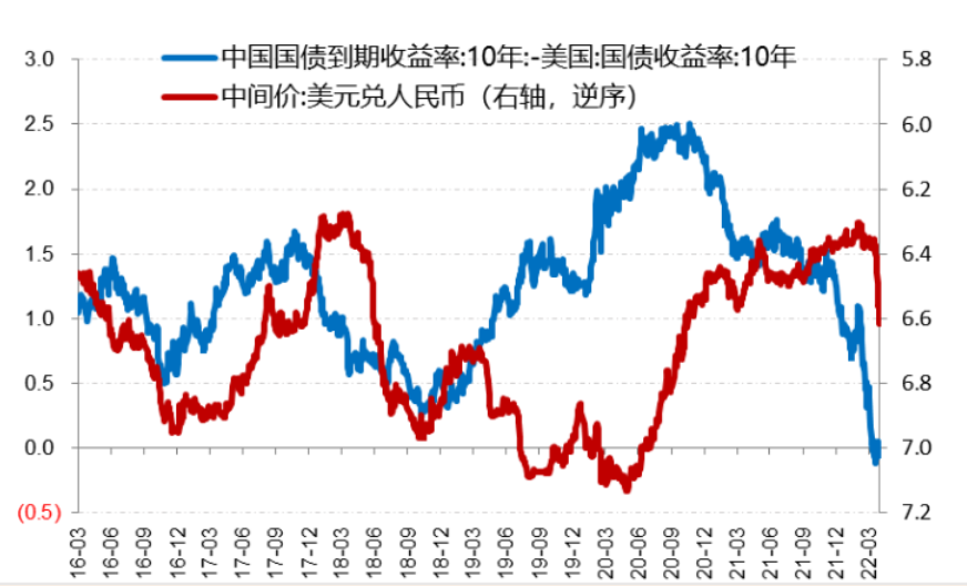 在美联储强加息周期下,中美利差出现倒挂,资本外流,人民币贬值。尤其是4月以来中美利差快速收窄到零附近,给人民币造成贬值压力(下图)。