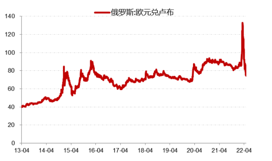 俄乌冲突是欧元疲弱的一个重要原因,在欧洲大陆上发生的这场战争冲突可能将欧洲带入滞涨的泥潭。欧洲正在承受高能源价格,这使欧洲的制造业面临困境,欧洲经济下滑风险越来越大。4月28日欧元兑美元1.047,离创20年新低仅一步之遥。而同时普京宣布“卢布结算天然气”以来,卢布已收回全部跌幅,这进一步打压对欧元的需求。从结果来看,俄乌冲突使制造产业为主国家货币受到伤害,而资源国货币受到青睐。