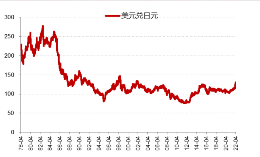 美元指数中的另一货币日元同样出现了前所未有的贬值。4月28日美元兑日元升破131高位,日元创下20年来最大的跌幅,并可能进一步下跌,不排除冲击150-200的可能。日本央行与美联储截然相反的态度是日元下跌重要原因。4月28日日本央行宣布继续实施大规模刺激措施,并承诺将继续无限量购买10年期国债,使10年期国债收益率目标维持在0%附近不变、将基准利率维持在-0.1%不变。与美联储和其他加息并停止购买债券的国家相比,日本央行这一举措的差异是如此之大,并且没有改变政策的意图,这让日元一下跌破130的关键点位,并可能进一步下跌。