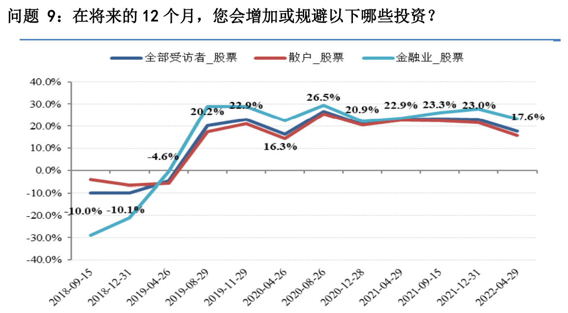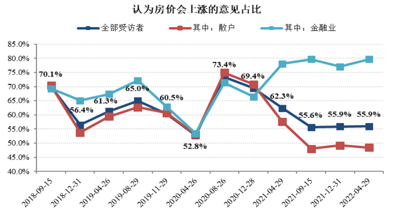 事实上,从2021年开始,散户就已初现悲观情绪。散户和金融业投资者对A股的预期在2021年出现明显分化,金融业调高了对A股的预期,散户则调低了预期,截至2021年末,金融业中认为A股会上涨的人数比散户高出31个百分点。在本期调查中,二者的预期差异有所缩小,但仍有差距。