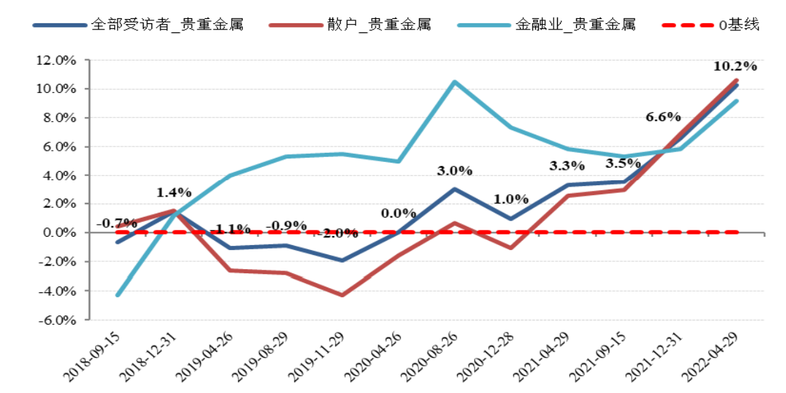 本期,这种情绪继续延续:愿意投资股票、股票型基金净增加人数占比为 37%,比上期下降 7.9 个百分点;愿意投资银行理财以及稳健型基金的净增加人数占比为 83.4%,比上期提高了 7.5 个百分点;愿意投资黄金等贵金属的净增加人数占比为 10.2%,比上期提高了3.6个百分点,比2020年4月提高了10.2个百分点。