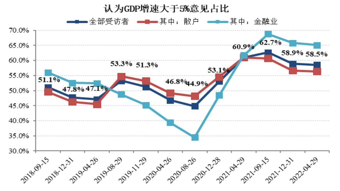 然而,2021 年下半年以来,这种回暖趋势开始发生逆转,在上一期的调查中,投资者下调了对经济增长的预期,本期,投资者对经济增长的预期与上期相比变化不大,约58.5%的投资者认为未来GDP增速能够超过5%,比上期下降了0.3个百分点,比2021年9月下降了 4.1个百分点。