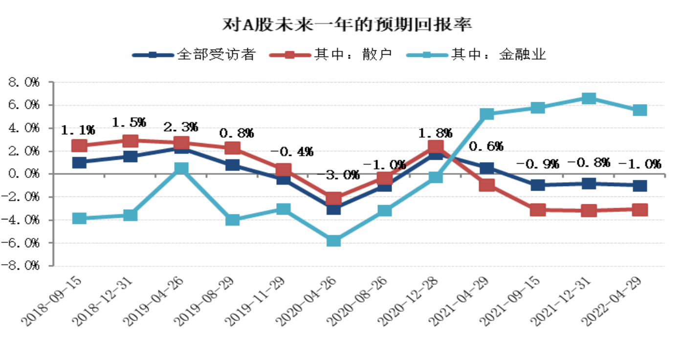 预期回报率方面,自2021年末至今,散户对A股的预期回报率一直为负,本期散户对A股的预期回报率是-3.1%,比上期提高0.1个百分点。与此同时,金融业对A股的预期回报率是5.7%。