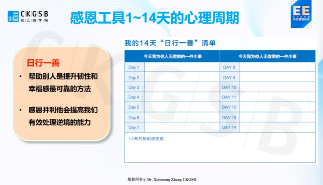 由于时间关系,今天我们从整个韧性飞轮的每一个叶片选取一个工具——聚焦“觉察的解码焦虑”、“意义的专注热爱”、“连接的感恩利他”这三个小维度所形成的韧性小飞轮。