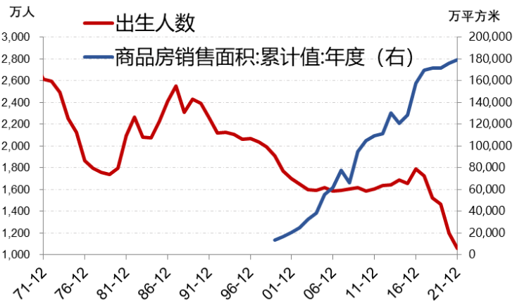 出生人口下降也是房地产需求不足的原因。2021年中国出生人口1062万,商品房销售面积17.94亿平,如果按照100平米/套,约1800万套。如果按照目前的出生人口速度,很难持续有1800万套住房需求。换个角度讲,当前的出生人口对应着约25年前(1990-2000)出生的人口结婚生子,1990-2000年出生人口从2500万/年下降到约1600万/年,这部分人当前都结婚,也消化不了平均每年1800万套房需求(下图)。