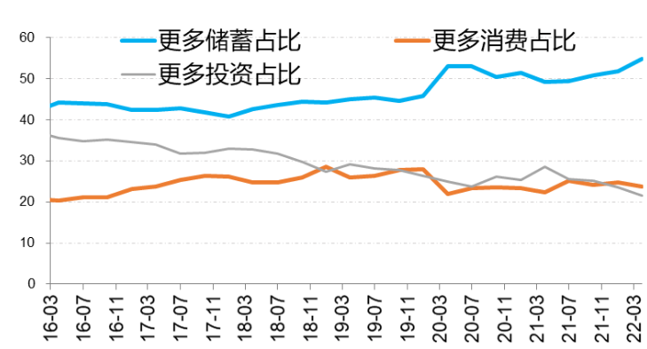 图:央行调查更多储蓄与更多消费及更多投资占比情况