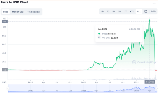 图表1是Luna历史价格走势。2020年3月12日,每枚Luna价格仅0.1201美元,之后一路上涨到2022年4月4日的历史最高收盘价116.41美元。Luna的价格从4月4日的近120美元跌至5月7日的77.46美元,用了一个多月时间;从5月7日的77.46美元,跌至5月13日的0.000102美元,只用了一周。