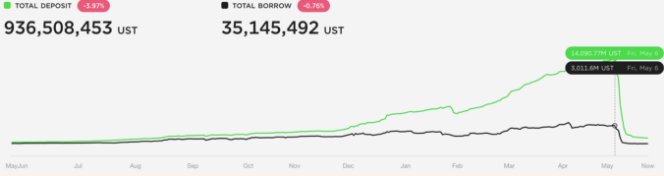 不过人性的贪婪,还是会让人忘记风险。Anchor推出后大受投资者欢迎,平台上的UST存款量越来越大。图表3是Anchor平台上的UST存款数量。一年前的6月2日,Anchor上的UST存款是2.85亿枚,到今年5月6日,存款增加到了140.9亿枚,不到一年时间增长了近50倍。相应地,贷款也从1亿枚增加到了30亿枚。