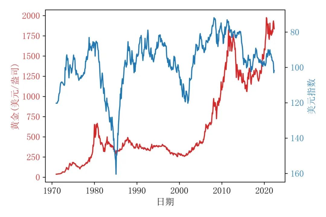 图表2:伦敦现货黄金价格与美元指数的走势(1971年1月至2022年5月)