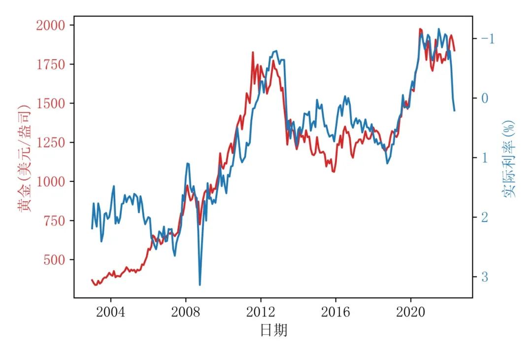 图表3:伦敦黄金现货价格与美元实际利率的走势(2003年1月至2022年5月)