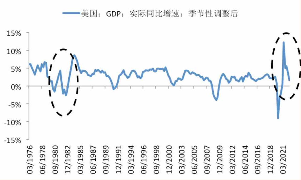这方面我们可以对比1970年代末期到1980年代初期美国的经济情况。当时美国出现了严重的滞胀,1980年3月和4月的CPI同比增速接近15%,但1980年第二季度和第三季度的GDP同比增速却是-0.8%和-1.6%。为了应对通胀,当时美联储不顾经济疲软的情况,大幅加息,1980年3月和4月的联邦基金利率均超过17%,1981年6月和7月甚至超过19%。在高利率的作用下,CPI同比增速开始逐渐下滑,美国的通胀形势一步步缓解,而GDP同比增速也开始明显下滑,经济出现衰退。更重要的是,失业率上升到非常高的程度(图表 5)。