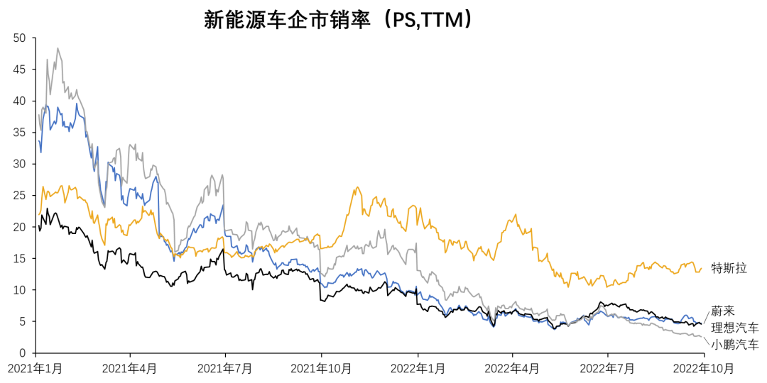 “蔚小理”市销率在业绩成长和估值下跌的双向影响下,已经回落到了个位数,依次分别为5.4倍、3.0倍和4.9倍,远低于其两年前的水平,也显著低于现在特斯拉13.6倍水平。但依然比传统车企的市销率高很多(如丰田0.9倍、吉利1倍、长城0.6倍)。