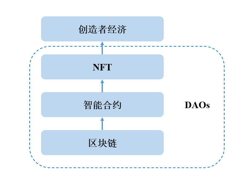 综上所述,在区块链技术上构建的智能合约,是创建NFT与DAOs的基础。NFT的繁荣又推动着创造者经济的发展。这些核心要素保障了Web3.0系统中用户对内容的所有及价值的共享,从而推动着新型商业模式与组织架构的演进。
