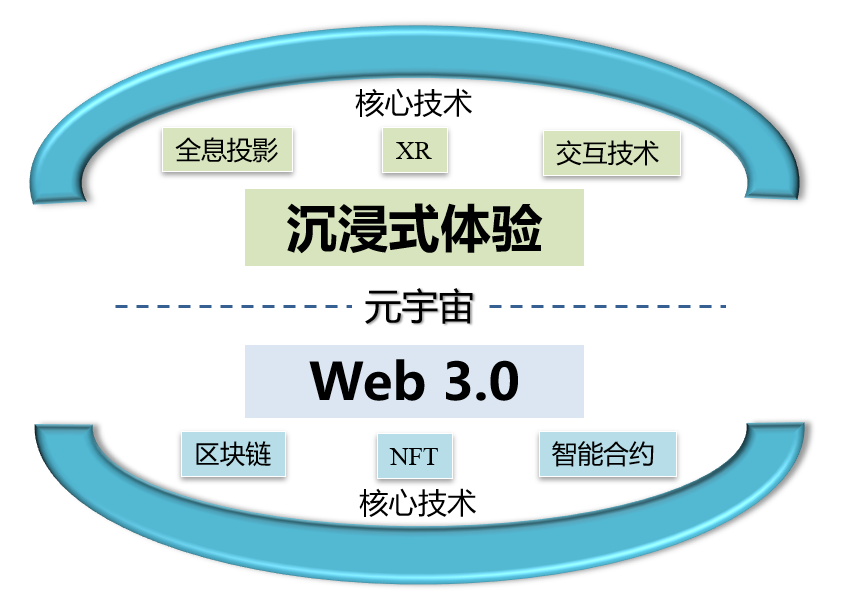 “广义元宇宙”的核心技术。我们暂且把扎克伯格提出的元宇宙概念称之为“狭义元宇宙”,本文所讨论的“广义元宇宙”则是“狭义元宇宙”与Web3.0的结合,是架构在Web3.0基础之上的沉浸式体验。