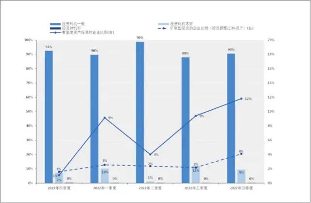 中美贸易战对企业的影响在2022年度有所减弱。认为有负面影响的企业比例从2018年中美贸易战开始增长,在2018年四季度达到18%,2019年该比例小幅增长至19%。2020年一季度该比例增至27%并全年维持在20%以上,直到2021年开始放缓并于2022年四季度降至10%。四季度有90%的企业认为贸易战对企业无影响。
