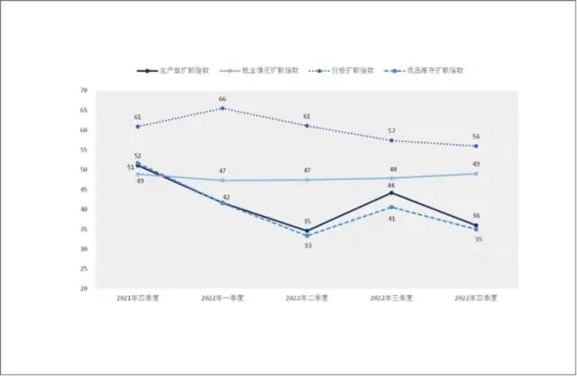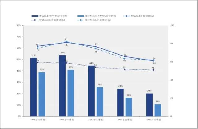 产业经济的第二大挑战,成本上升的矛盾在2022年得到明显缓解。成本扩散指数从一季度的81降至四季度的61,达近两年来最低,但仍处于扩张区间(图4)。这主要是原材料成本和劳动力成本连续三季度下行所导致。与此对应的成品价格扩散指数也从年初的65.5在四季度降至56。