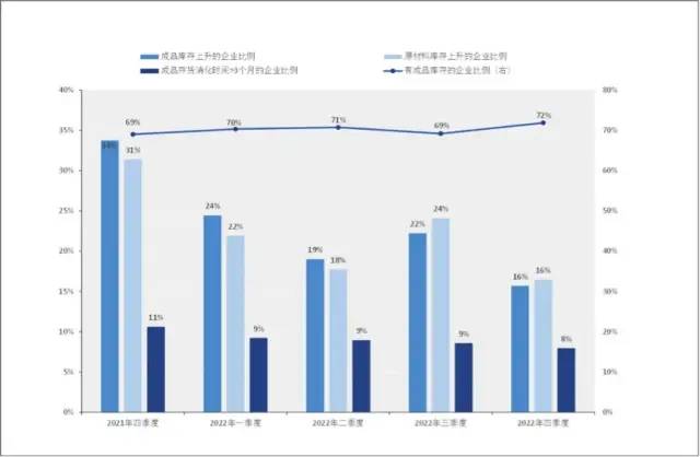需求不足尚未带来明显的库存问题。2022年有成品库存的企业比例小幅上涨,四季度达到72%(图9)。反映原材料和成品库存量上升的企业在减少,认为成品存货不能在3个月内消耗完的企业比例自2021年三季度开始持续下降。2022年四季度内,92%的企业认为其库存可以在3个月内消化,7.5%的企业认为会在4-6个月内消化,仅0.5%的企业需要半年以上的时间消化库存。库存水位回落表明企业正在通过控制库存应对需求不足的预期以及对未来经营情况持谨慎态度。