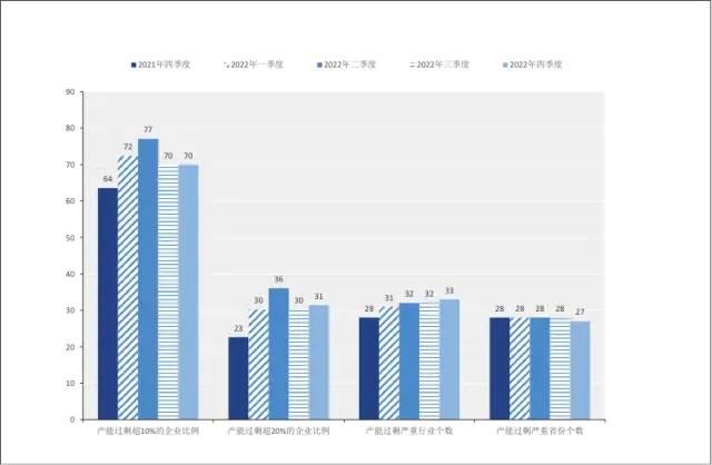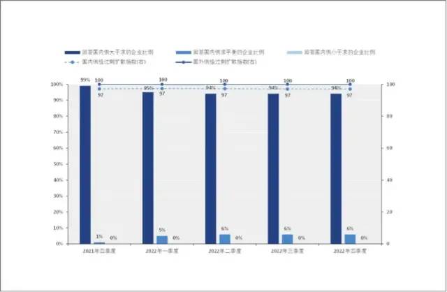 2022年产能过剩仍然为产业经济面临的重大挑战。造成产能过剩的主要原因是需求不足,国内消费市场尚未激活,国外市场面临前所未有的挑战。反映国内供给过剩的扩散指数2022全年维持在97%的高位,而反映国外供给过剩的扩散指数自2021年三季度起超越国内指数,于2022年全年维持在100%的最高点,这表明国外地区的供需矛盾已经高于国内市场。2022年四季度,70%的企业产能过剩超过10%,31%的企业产能过剩超过20%,超过百分之八十的行业和地区产能严重过剩(图3)。