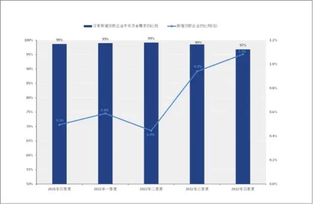 融资仍然不是限制产业经济的因素。2022年内有新增贷款企业比例虽有增长,但处于极低水平。每季度仅0.4%~1.1%的企业有新增贷款(图8)。在四季度没有新增贷款的企业中,有97%表示没有资金需求。有新增贷款的企业中,41%反映银行借款容易,59%表示借款难度一般,没有企业认为借款困难。反映银行借贷态度的扩散指数在2022年显著上升,从2021年四季度的51上升至2022年四季度的66,进入宽松区间。所有类型企业借贷态度的扩散指数均处于枯荣线上或以上。
