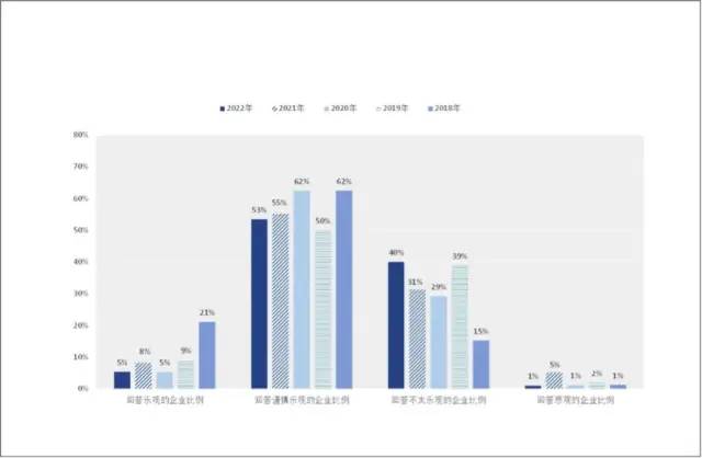 2022年四季度,58%的企业对未来3-5年的经营状况持有乐观(5%)或谨慎乐观(53%)的态度变化不大(2021年:8%和55%)(图5)。回答不太乐观(40%)和悲观(1%)的企业表示其主要是对于订单不足和宏观形势的担忧(2021年:31%和5%)。值得注意的是,对未来3-5年持悲观态度的企业从2021年的5%下降至1%,重返2015年以来的水平。整体来看,经历过疫情的冲击加上2022年底的重新开放,企业对于前景的悲观情绪明显减弱,但仍有相当数量的企业持有较为谨慎和不太乐观的态度。随着疫情对经济活动的限制减弱,以及国家出台的一系列利好中小企业发展的政策,预期企业对于经营前景的信心会慢慢恢复。