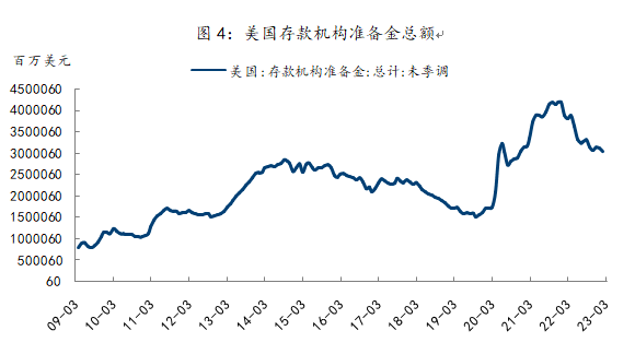 对于美国大型商业银行来讲,监管会更加严格,硅谷银行风险蔓延扩大到美国大行概率较小。另外,实际上商业银行在美联储的存款机构准备金还在3.03万亿美元水平,这部分准备金应该主要由大型商业银行持有,应对流动性冲击应当比较充分(图4)。