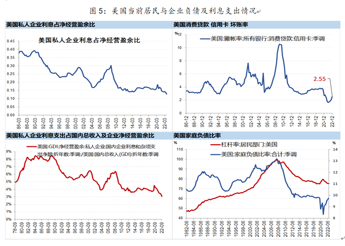另外,美国当前出现类似2008年债务危机的可能性也比较小。当前美国居民与企业部门债务水平远低于2008年,这导致美国消费贷款坏账率偏低,企业债务利息支出也不高(图5),这使得美国居民与企业部门有更多时间来应对加息,出现类似2008年债务危机的可能性也较小。同时,当前金融机构账上衍生品资产占总资产比例也远低于2008年。唯一要关注的是美国国债占GDP比例为120%,持续加息将使美国国债面临还款压力,并使国债面临违约风险,这一点需要关注。