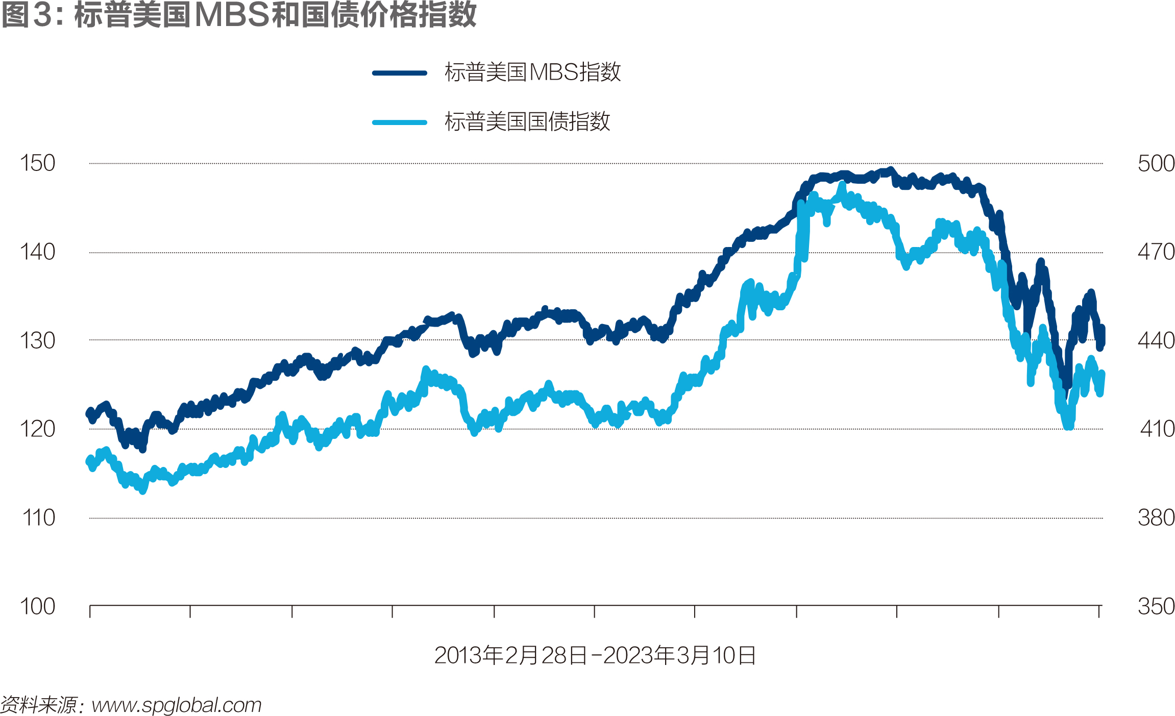 图3是标普美国MBS和国债价格指数。自2022年3月开始加息,MBS价格指数一路走低,至同年10月底的低点大概下降了20%,此后开始反弹。进入2023年3月以来,价格指数还是上升的,目前的指数水平接近于2018年底。国债价格指数走势类似。在2008年金融危机期间,雷曼兄弟持有的衍生品价格大幅下跌。再加上发行的金融产品大量卖给全球各地的其他金融机构,因此,雷曼兄弟破产后引发了连锁反应,对全球金融系统的影响的广度和深度都是硅谷银行破产无法比拟的。