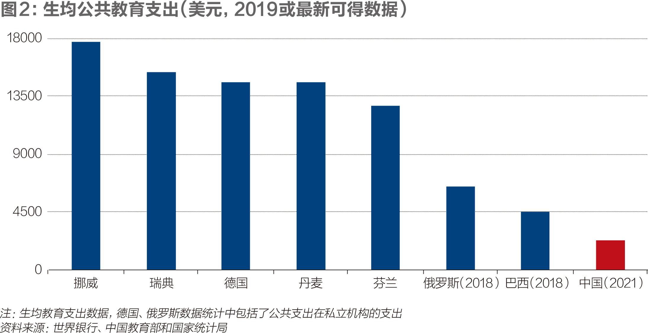 从人均教育支出来看,2021年,中国按照在校学生人数平均的一般公共预算教育经费为15356.59元(约合2230美元)。按照OECD数据,从小学到高等教育,2018年俄罗斯生均支出6430美元、巴西为4448美元,均高于中国。本文所考察的欧洲国家,2019年人均教育支出均超过1.2万美元,其中挪威超过1.7万美元。
