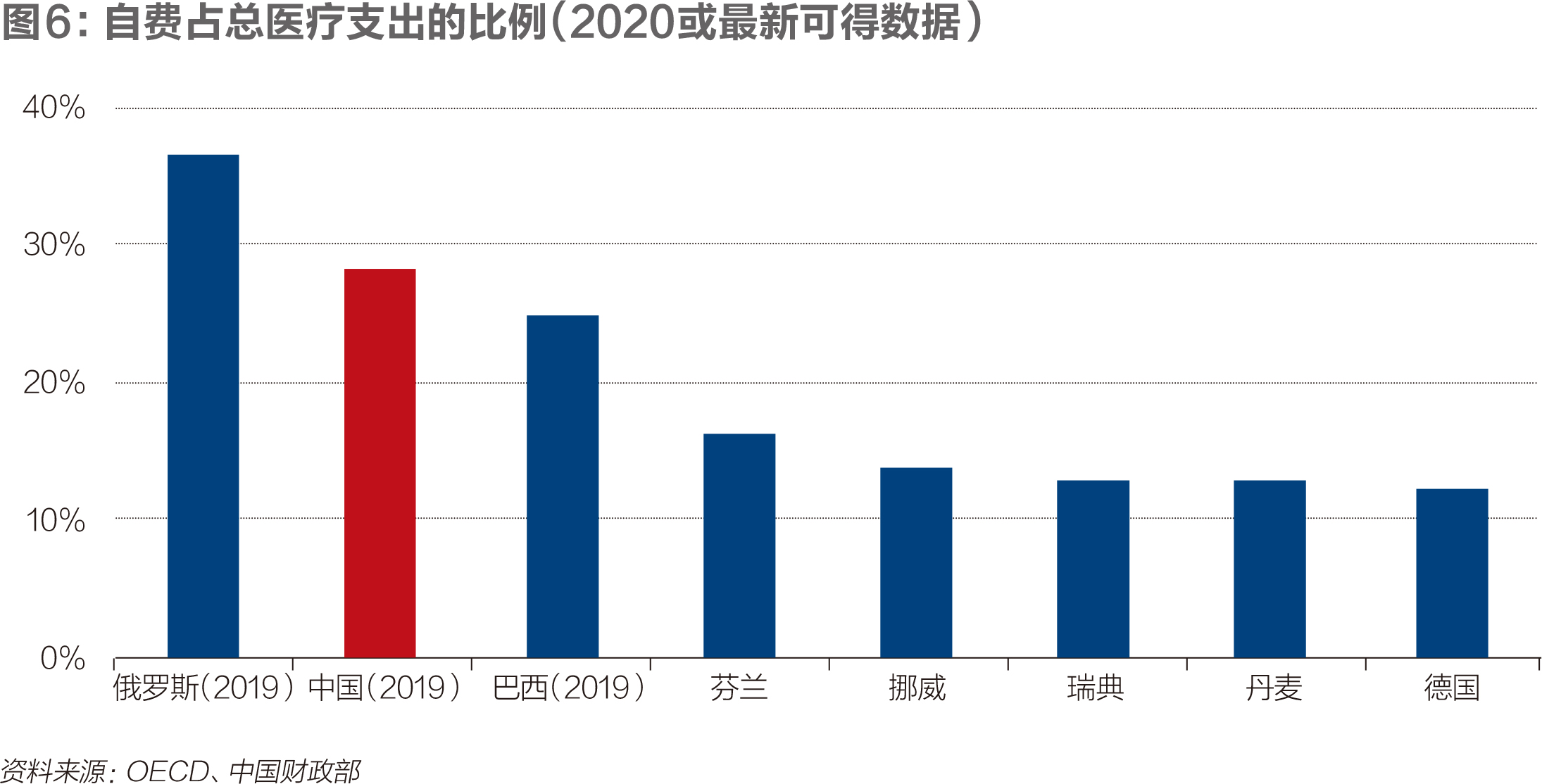 从医疗支出的资金来源看,发展中国家与发达国家差距明显,自费比例明显增高。世界卫生报告(2010)提出,如果实现消除因病致贫的目标,个人直接医药付费比例应当控制在15%-20%。根据财政部统计,2019年,我国个人卫生支出占比为28.4%,仍然偏高,也不及巴西(24.9%),但低于俄罗斯(36.6%)。
