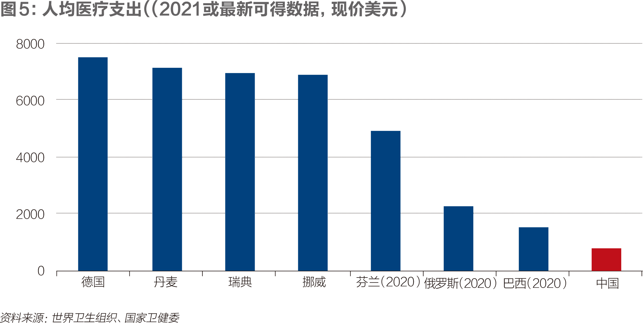 WHO用全民健康覆盖(Universal Health Coverage,UHC)指数评估一个国家在提供必要的优质基本卫生服务方面的总体进展情况。2019年,UHC有效覆盖率指数达到80以上,需要各国人均支出超过1398美元。以此为参照,根据世卫组织的统计,按照平价购买力计算,北欧国家、德国(7517美元)、俄罗斯(2278美元)、巴西(1529美元)都在这一标准之上。中国人均医疗支出(5348元,约合765美元)较低。