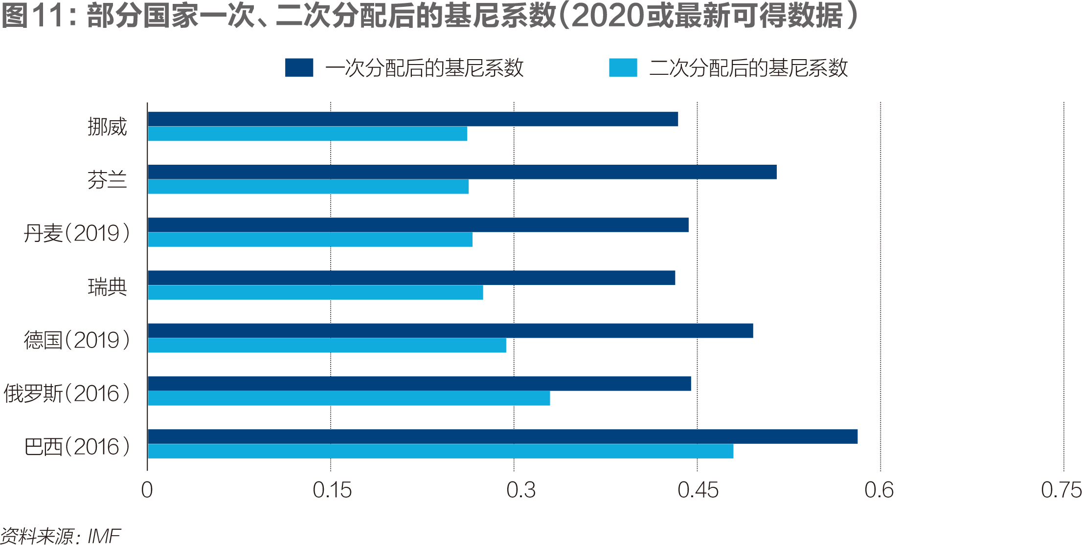 根据国际劳工组织数据,从不含医疗的社会保障支出来看,中国的公共支出仅占GDP的7.2%,不仅与芬兰(24.4%)、丹麦(22.2%)、德国(19.4%)、挪威(19.1%)和瑞典(19.5%)等国差异显著,也低于巴西(15.7%)、俄罗斯(13.4%)。从一次、二次分配后的基尼系数来看,部分西欧,尤其是北欧国家,其二次分配政策显著降低了一次分配带来的收入不均,保障了收入分配的公平。各经济体一次分配后基尼系数普遍超过0.4(国际一般将0.4作为社会贫富差距的警戒线),收入差异显著。