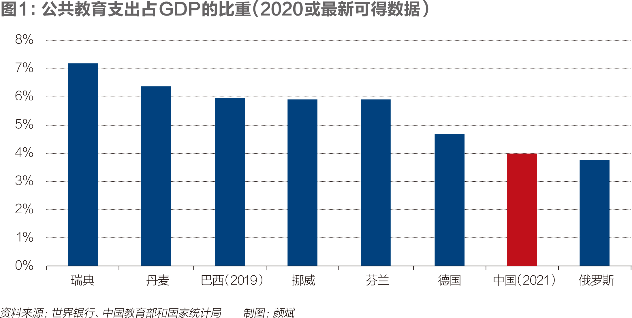 从投入大小来看,北欧国家公共教育支出占GDP比重均接近或超过6%,其中瑞典以7.2%领先。2020年,世界各国在教育上的公共投入平均为4.3%。虽然已经连续多年增长,2021年中国公共教育支出(4.01%)仍略低于世界平均水平,不仅与北欧国家有较大差距,而且低于巴西(6.1%),但略高于俄罗斯(3.7%)。