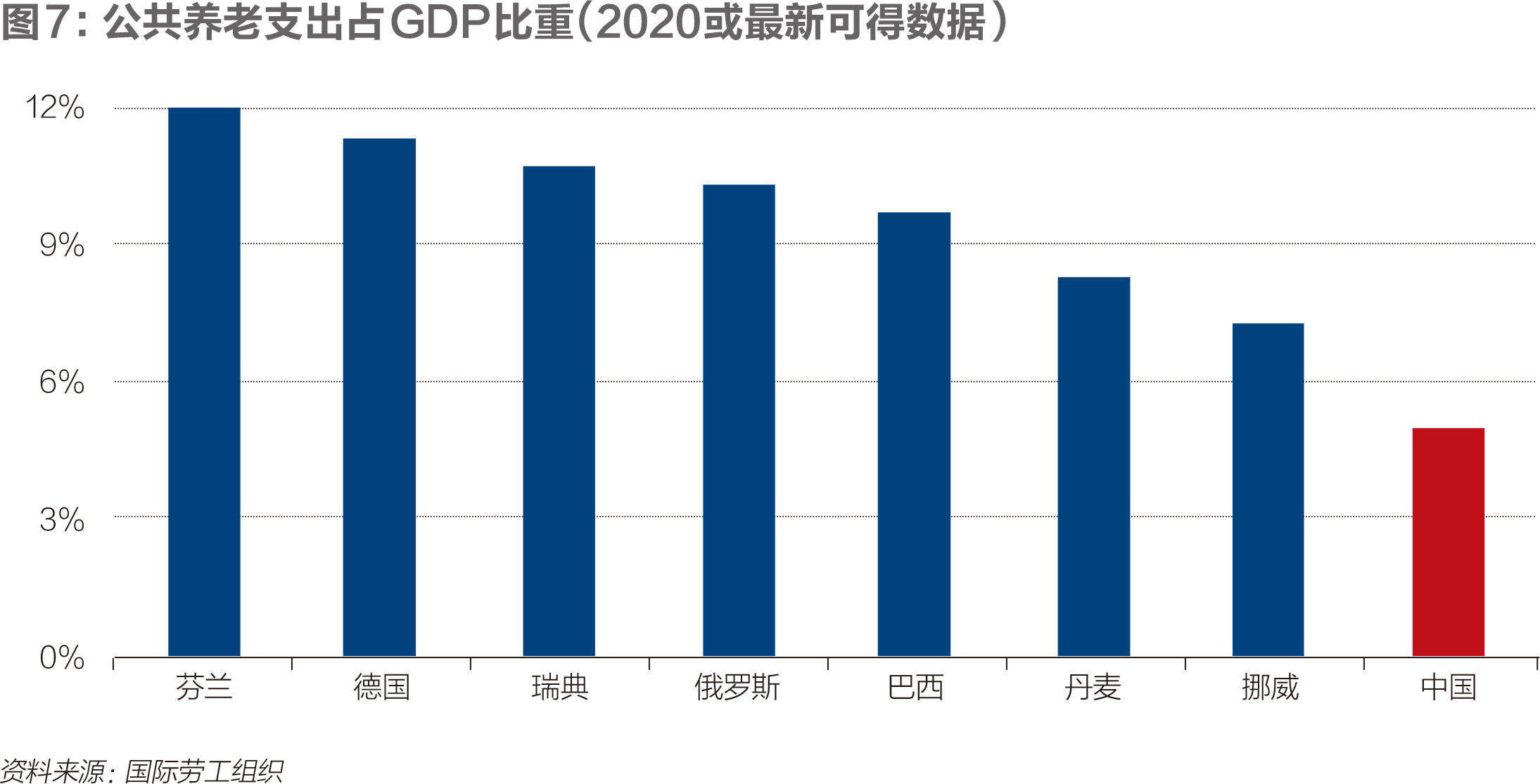 根据国际劳工组织的数据,瑞典用于养老的公共支出占GDP比重约为10.7%。公共养老支出往往是社会支出中占比最大的一项,目前全球平均公共养老支出占GDP的比重约为7%。随着老龄化加深,这一比例预期还会升高,也提出了养老保障是否可持续的问题。就具体国家而言,这一投入大小受养老金水平、年龄结构、养老服务等多因素的影响。据国际劳工组织的数据,俄罗斯(10.3%)、巴西(9.7%)公共养老支出占GDP比例均高于中国(5%)。
