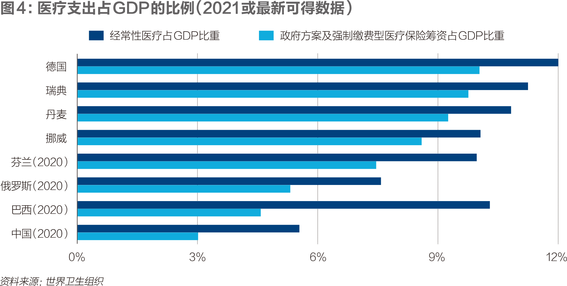 打造健全而高效的医疗体系历来是各国关注的重点,2021年US News全球医疗体系排名中,瑞典高居榜首。瑞典拥有全球顶尖的医疗水平,公民平等享受国家提供的公共医疗服务,医疗资金主要来自政府转移支付,占比约85%,体现了政府在医疗卫生方面的投入之大和高度重视。虽然实践中不乏对其效率的批评,但其分级诊疗的医疗体系维护了医疗资源的有效运转,整体上其公平与效率仍然广受业界肯定。