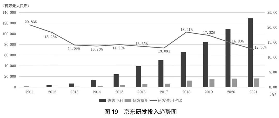 从图19可以看到,京东研发投入的占比较低,而且,重视程度也呈现出一个下降的趋势。虽然京东研发投入不足,但这并不影响京东的科技创新。因为100多亿元研发投入,同样可以取得很多创新成就,包括在人工智能、智慧仓储等方面,京东都取得了一系列令世人瞩目的成果。所谓研发投入不足,只是从财报数据角度看到的差异。这是唯一可比的地方。至于技术创新的数量和质量,要全面系统评估会异常复杂。