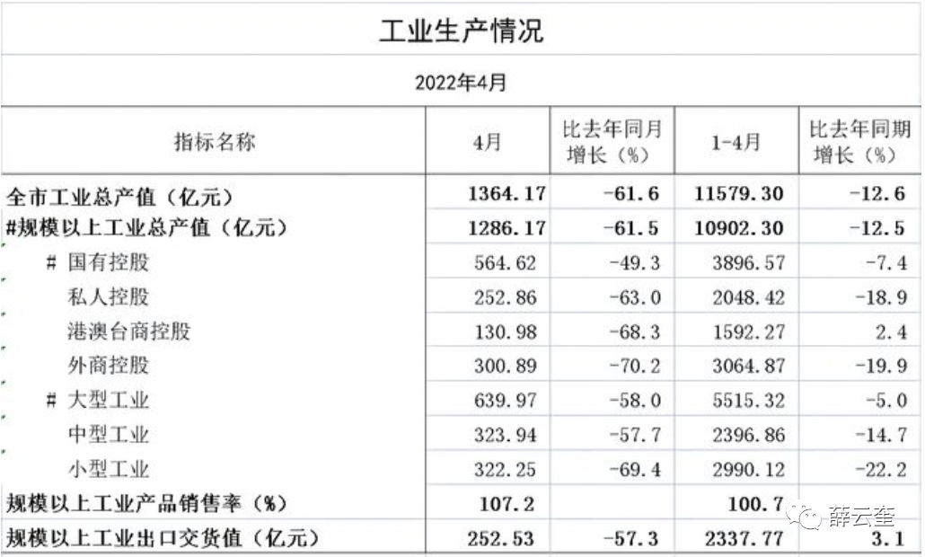 根据上海统计局最新公告,2022年4月实现工业生产总值1,364亿元,较上年同期下降61.6%,也就是说大约减少了850亿元。因为5月份的数据还没有出来,估计只有更坏,没有更好,所以,我们用4月份数据平均计算到5月22日,即封控52天累计损失的工业生产总值为1,473亿元。这还只是计算了上海的部分,没有涉及上海停工停产对周边省份,尤其是长三角区产业配套省份的影响。如果加上对全国GDP影响,估计又是一个巨量。