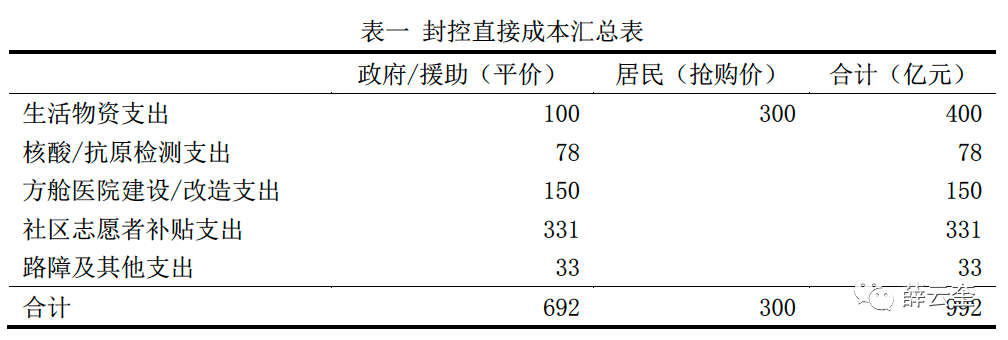 综合上述,我能想到的封控期间的直接成本大概也就包括如上五个部分,汇总起来大约为992亿元。当然,这只是一个估算数,原则上趋向稳健和保守,相信实际开支大概率会在这个估计值之上。