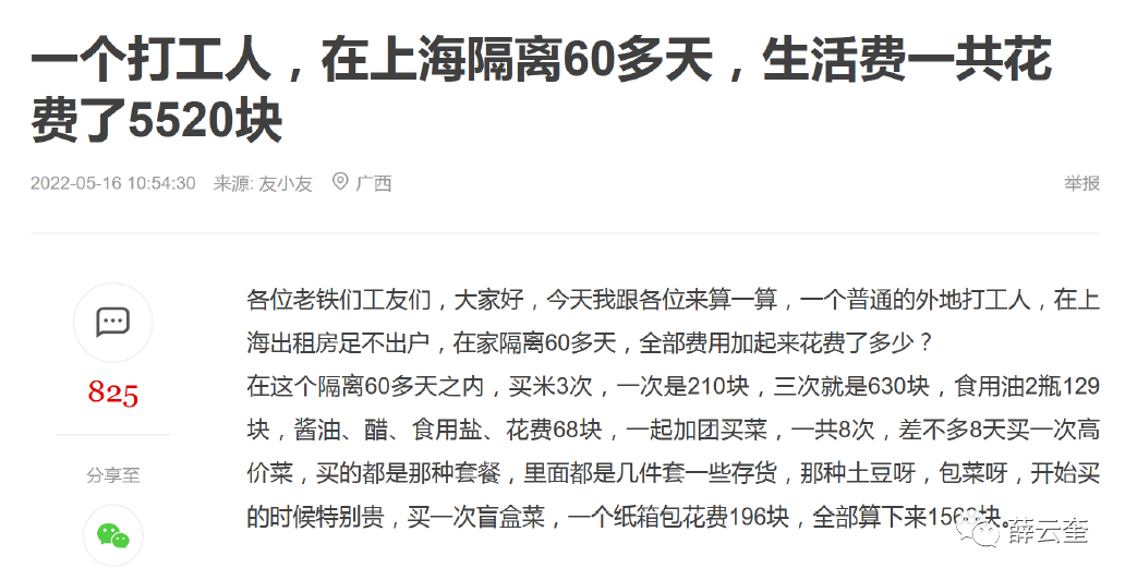 根据媒体报道的一位上海打工人隔离期间的生活花费②,总共是5,520元。扣除房租(每月900元)和水电(每月180元)开支,他的实际生活物资成本高达3,360元,远在我们的测算标准之上。